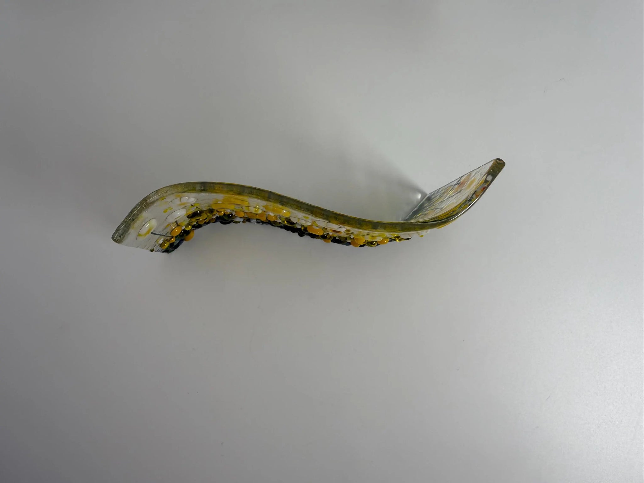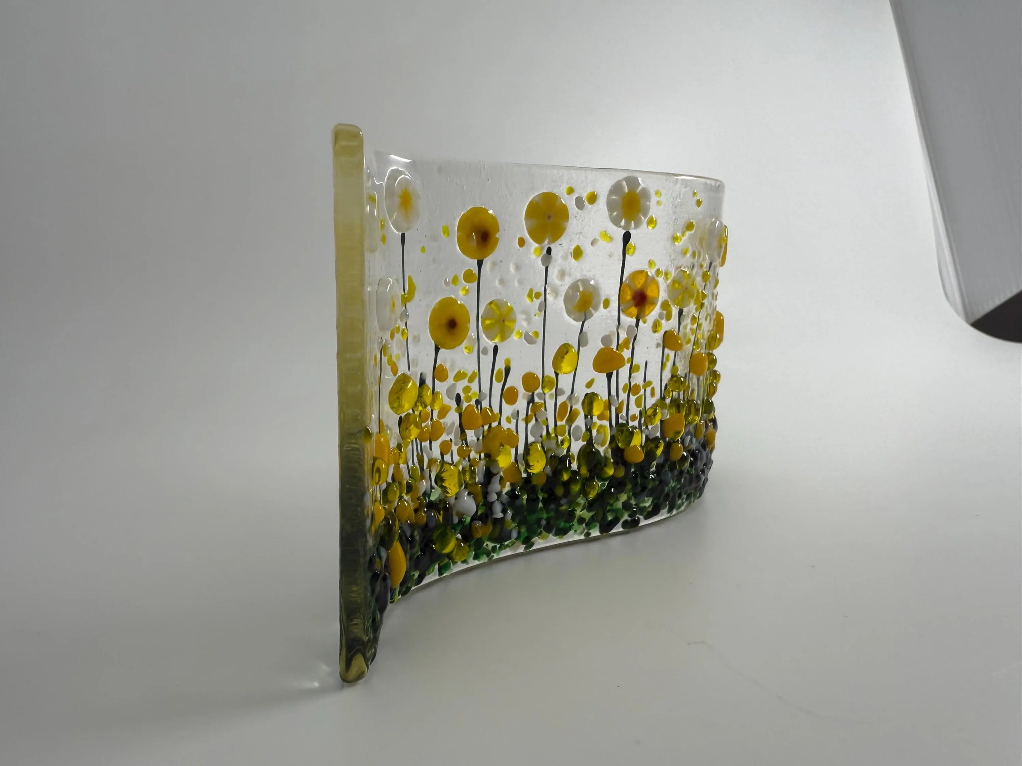 A beautiful handmade fused glass wave with white and yellow delicate flowers.